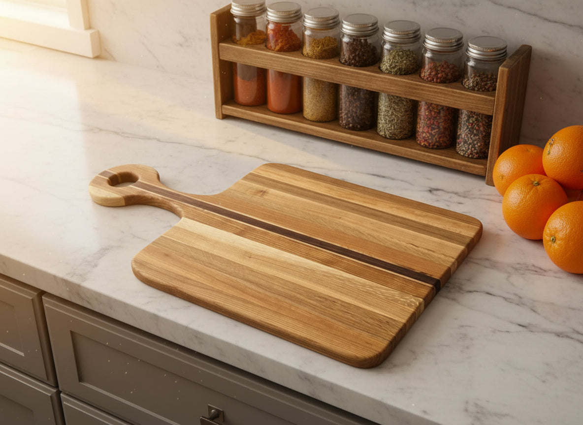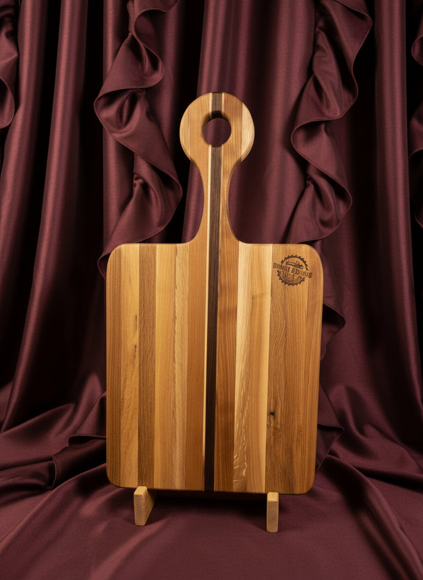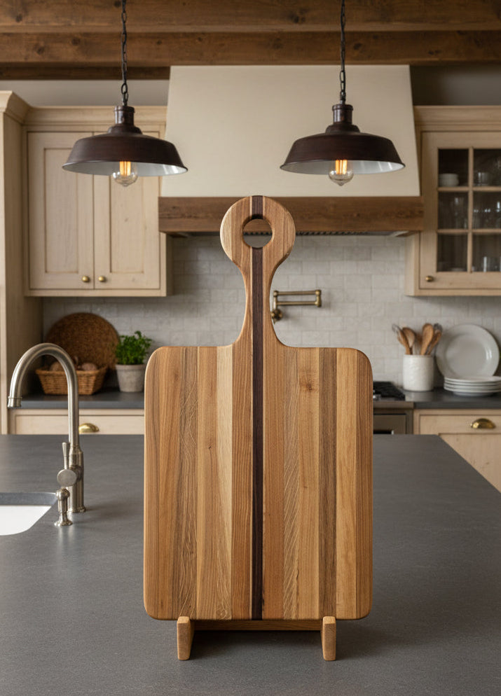 This lovely board is comprised of white oak, black walnut, maple, and cherry. It will look amazing when serving company, or hanging on your kitchen wall!