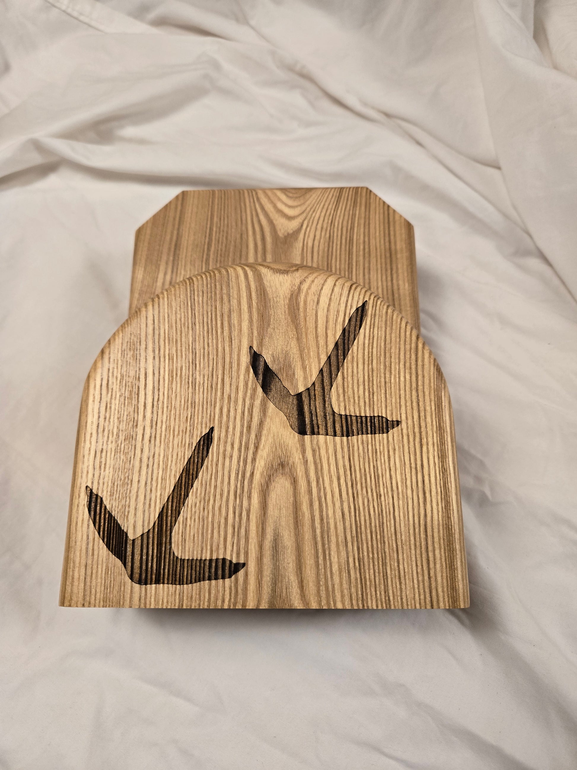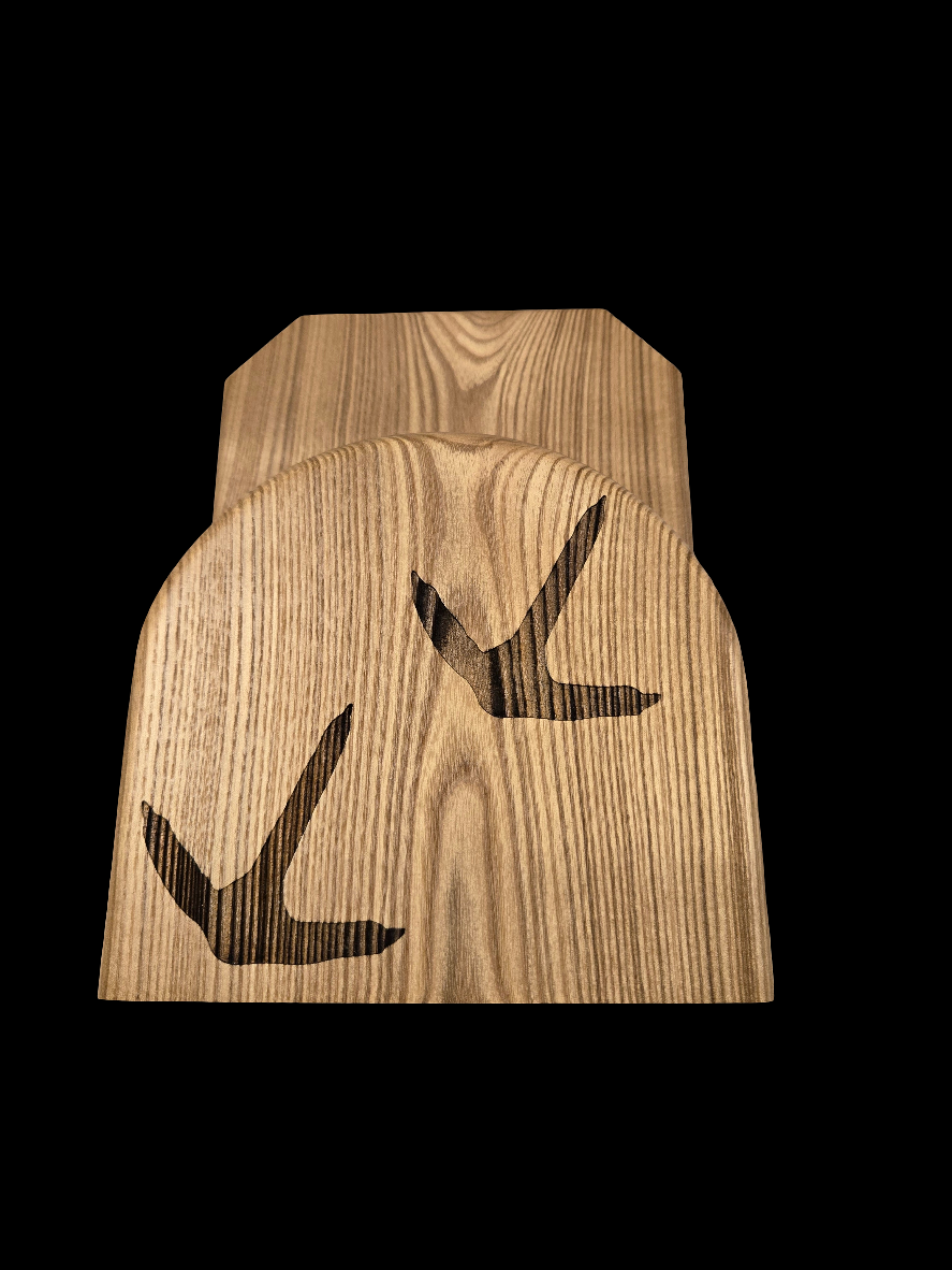 Dumke Designs turkey fan mounts are a great way to memorialize and display the harvest of a turkey! The wood is black ash with a little live edge. Artwork of a turkey tracks are laser engraved on the front. The back has a keyhole to hang on the wall and the bottom is flat so you can also choose to place it on a shelf or mantle. A 1/2" hole is drilled into the bottom to insert the beard when hung on the wall. The gap where you place your dried fan is 1.38" deep.